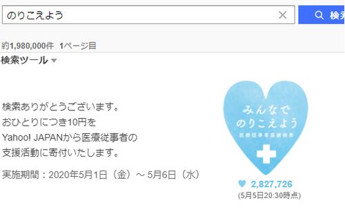 ヤフーの検索から 「のりこえよう」 と検索すると10円医療従事者への支援活動に寄付されます。 期間が5月6日までとなっております。 www.yahoo.co.jp ヤフー基金のこの取り組み クレジットカード、Tポイント、ソフトバンクのスマホからも 寄付が可能です。 …